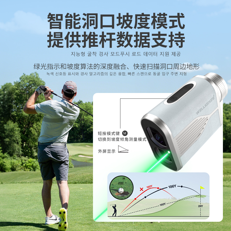创新是望尔生高尔夫测距仪V1的另一大看点,也是其树立高尔夫测距新风尚的关键所在。其独特的洞口坡度智能测距功能,通过绿光探测与坡度算法的完美结合,能够瞬间识别果岭地形,精确判断20-30米范围内洞口的地形变化。这一功能对于短距离推杆来说,无疑是提供了极为关键的数据支撑。它让选手在面对复杂地形时,也能从容不迫,轻松取胜,不再因地形不清而错失良机。